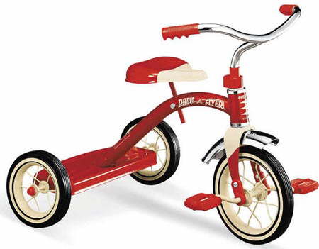 The Radio Flyer Classic Red 10" Tricycle is the trike that has been toting toddlers for years! Although the Radio Flyer Classic Red 10" Tricycle features a retro tricycle style, this trike has all the top accessories to provide kids with a safe, but fun, ride: sturdy steel construction, chrome handlebars and fender, durable steel spoked wheels with real rubber tires, adjustable seat, and controlled turning radius for stability.