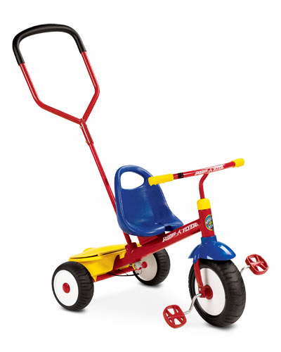 The Radio Flyer Steer & Stroll Deluxe trike featuring an innovative internal geared steering allows the adult to turn the front wheel with the push handle.