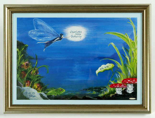 We will inscribe your chosen original print in handwritten calligraphy, with the child's name, weight, date and time of birth. We will then frame, complete with the glass. The individual details are written on the stone and plants in the picture and the name is shown by the fairy wand.