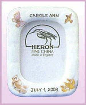 The child's name is hand painted in Gold at the top of the photo frame and the frame is fired to attain a supreme enamel finish. A maximum of 15 letters is allowed for the child's name. The date of birth is hand painted at the bottom of the 5" photo frame.