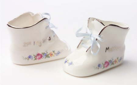 A wonderful cute little bootee with lovely blue ribbon. The baby’s name and date of birth is hand painted in gold and then the item is fired in order to give a supreme enamel finish. A maximum of 10 letters are allowed for baby’s name. A magnificent personalised and special gift for your baby. Size: 8cm