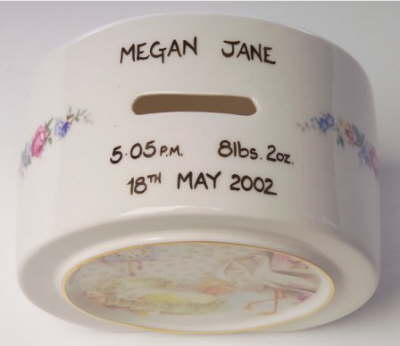 The child's name, date of birth, time of birth, and weight are hand painted in Gold across the top of the bank and is fired to attain a supreme enamel finish. The hands on the clock also indicate the time of birth. A maximum of 15 letters is allowed for the child's name. The Bank is 4" in diameter and 2 1/2 " deep.