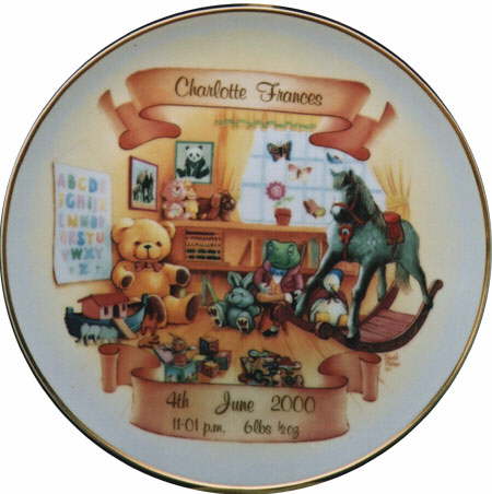 The Plate shows the picture of a typical Nursery scene with cuddly toys and a Rocking Horse. They can be personalised with baby's details. Each Plate or Clock is trimmed with 22carat Gold rim, and has a beautifully glazed finished making it an ideal way to remember that Special Occasion.
