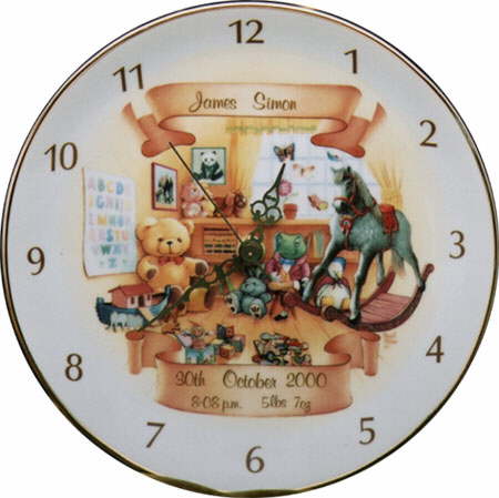 The Clock shows the picture of a typical Nursery scene with cuddly toys and a Rocking Horse. They can be personalised with baby's details. Each Clock is trimmed with 22carat Gold rim, and has a beautifully glazed finished making it an ideal way to remember that Special Occasion.