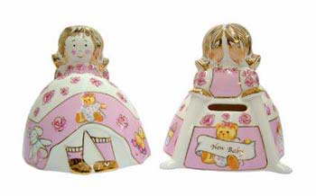 A lovely money box doll to celebrate the arrival of a new baby girl. This wonderful china doll is packaged in a luxury pink gift box and is an ideal keepsake gift for a new baby girl. This gift is handmade from English bone china in Staffordshire. The doll has finely painted gold details and 'New Baby' is written in gold on the doll’s back to commemorate the arrival of a special baby girl.