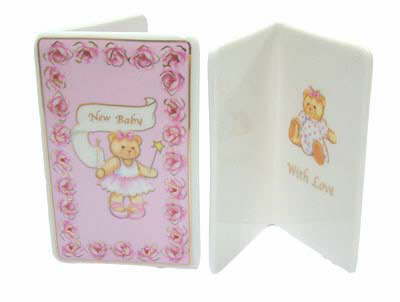 A lovely New Baby card packaged in a wonderful pink gift box This gift is handmade from English bone china in Staffordshire. The outside of the card says “New Baby” to commemorate the special occasion. On the inside the card reads 'With Love'.