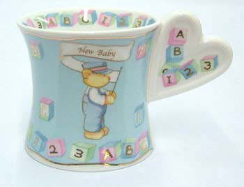 A lovely New Baby cup with a heart shaped handle, packaged in a wonderful blue gift box This gift is handmade from English bone china in Staffordshire. The cup has gold painted details and it says “New Baby” to commemorate the special occasion.