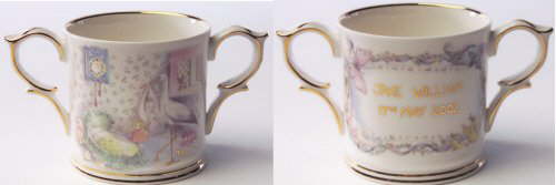 The child's name and date of birth are hand painted in Gold on one side of the cup. On the reverse side, the hands on the clock indicate the time of birth and the weight appears just below the stork. A maximum of 15 letters is allowed for the child's name. The Cup is 3" in diameter and 3" high.