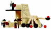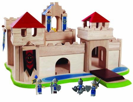 A fun filled wooden castle built on a firm wooden base. The castle is versatile and includes 2 play scenarios. Can be played with as a complete castle or the tower can be taken out to make 2 smaller castles. The double sided fabric banners and the tower roof can be turned over to change the castle’s identity. Features include trap door, collapsible wall and a throne that can be lowered for escape. Includes 4 armoured characters all ready for the action to begin.