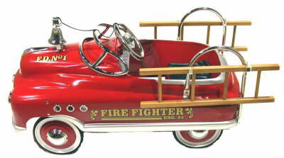 Red Fire Chief Comet Pedal Car features a black padded seat for comfort, working bell, Fire Chief decals, chrome hood, chrome windshield, removable ladders, chrome headlights, chrome grill ornaments, chrome steering wheel, chrome portholes and hubcaps. Body made from heavy gauge steel, no plastics used. Built just like the Murray Comet cars were made in the 50's, this car is guaranteed to keep your child amused for hours and is sure to become a family heirloom.