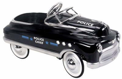 Black Comet Police Pedal Car features a Black padded seat for comfort, Police decals, chrome hood, chrome windshield, chrome headlights, chrome grill ornaments, chrome steering wheel, chrome portholes and hubcaps. Body made from heavy gauge steel, no plastics used. Built just like the Murray Comet cars were made in the 50's this car is guaranteed to keep your child amused for hours and is sure to become a family heirloom.