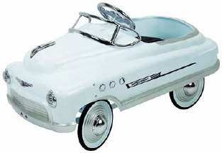Powder Blue Comet Pedal Car features a black padded seat for comfort, chrome hood, chrome windshield, chrome headlights, chrome grill ornaments, chrome steering wheel, chrome portholes and hubcaps. Built just like the Murray Comet cars were made in the 50's this car is sure to become a family heirloom. Sealed bearing pedal mechanism with 5 position pedal adjustments to suit most kids 2 to 7 yrs of age. All metal - steel construction with solid Duralast rubber tyres. Safety tested & approved. Fully assembled when delivered. Dimensions: 17" wide, 39" long and 21" tall.