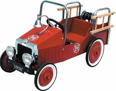 Entry level georgeous little bright red Fire Truck. Based on a 1929 model, this all steel item enjoys a more truck like front end. Designed for younger children, ages 2 to 4 yrs, it comes complete with chrome fireman's bel, wooden ladders & rubber hose reel. Very attractive in every detail, solid and durable, this is a must for the little ones!!