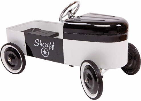 New for this year. A classic metal pedal boatThis black and white vintage metal pedal boat will provide hours of nautical fun for little sailors playing sheriff of the high seas. Features rubber wheels and chrome steering wheel. Dimensions: Length 86cm x Height 45cm Age: 3-5 Years