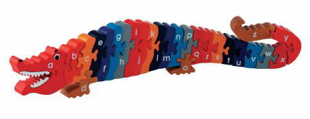 Learning the alphabet has never been more fun. This colourful large crocodile animal jigsaw is made up of easy to handle chunk rubber wood pieces. When pieced together he is happy to stand on a shelf or window sill. These hand made beautiful jigsaws are not just for learning the alphabet but also colour and shape recognition and co-ordination.