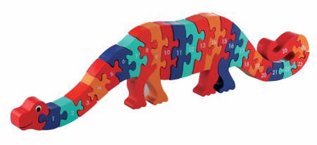 Learning numbers has never been more fun. This colourful dinosaur jigsaw is made up of easy to handle chunk rubber wood pieces and will help your child count to 25. When pieced together the dinosaur is happy to stand on a shelf or window sill. These hand made beautiful jigsaws are not just for learning how to count but also colour and shape recognition and co-ordination.