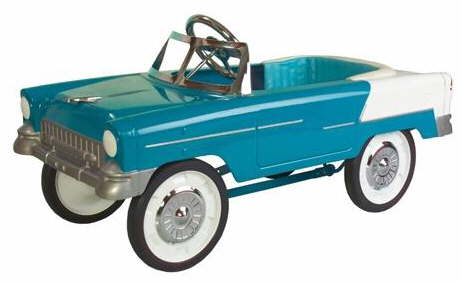 This beautiful pedal car is finished in blue/cream and will allow your children to travel round in style wherever they are! This car is styled from a classic Chevrolet, which were made famous for their superb designs of motorcars in the 1950`s. It has a chrome windshield, chrome steering wheel, chrome hubcaps, leatherette padded seat, sealed bearing mechanism, solid duralast tyres for longer life and all steel construction.