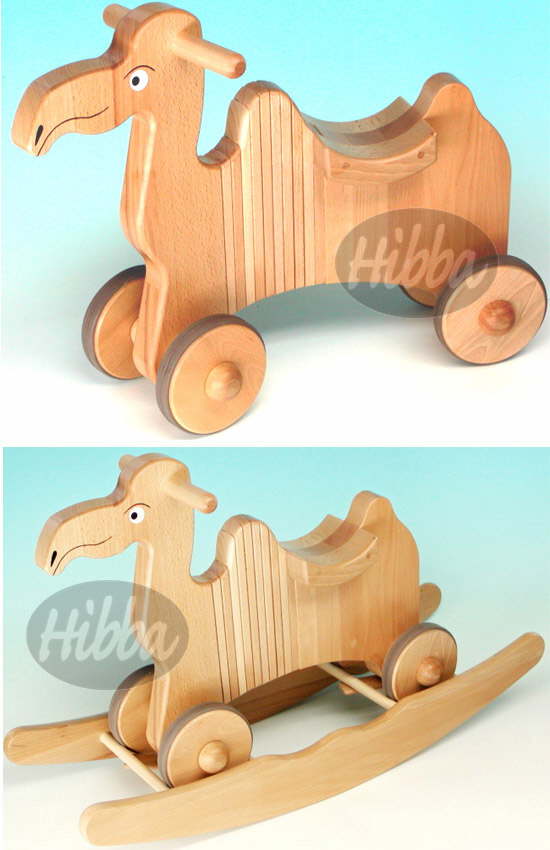 This is a great wooden combi camel because it comes with a rocking base so it can be used as a rocking toy and also has wheels so it can be used as a ride on toy, 2 in 1.