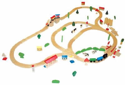 This 100 piece wooden railway set is simply beautifully. Superbly crafted out of chunky wood, this huge set includes the pieces to construct a long winding train track, including a hump-back bridge, plus houses, trees, vehicles, road signs and inhabitants to create your very own village. The magnetically connected train and carriages glides smoothly around the track and the whole set will be adored by any child it is given to. Unlike many of today’s plastic train sets, the wooden overhead railway has an elegant charm about it, with its pine coloured track pieces and colourfully painted accessories. This train set will really stand the test of time, and unlike today’s plastic and electronic ‘throw away’ toys, this wooden set will be cherished and loved by many generations to come. Age: 3 Years+ Size: 120cm X 60cm. CE Approved
