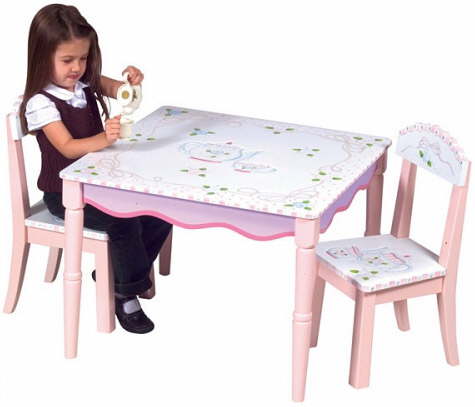 The ideal spot for tea time with a friend! This brightly coloured wooden table comes with two chairs. Assembly required.