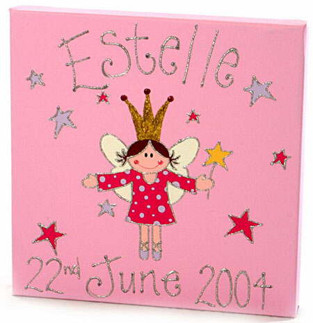This gorgeous hand finished personalised Fairy Wishes canvas is a perfect accessory for a girl's room and an ideal new baby, christening or birthday gift.