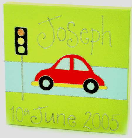 This hand finished personalised Bubble Car canvas is a perfect accessory for a boy's room and an ideal new baby, christening or birthday gift.