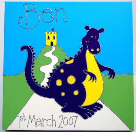 This smiley hand finished personalised Magic Dragon canvas is a perfect accessory for a child's room and an ideal new baby, christening or birthday gift.