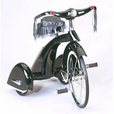 Black Road Hog Trike; Black Powder Coat with Chrome Insignias; Solid Rubber Tyres; Chrome Spoked Front Wheel; Working LED Light; Reflectors; Black Leather Tasselled Adjustable Spring Seat with Pouch; Rubber Handle Grips and Black Tassels; All Steel Construction; Sealed Ball Bearing. Height 26 Inches. Suitable for Ages 2 - 6 Years.
