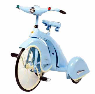 Hugely popular this year, after featuring in several Celebrity magazines. The blue trike has a leather look sprung saddle, wheel mudguards, working headlight, leather handlebar tassles finished in white, adjustable seat height, and metal spoked wheels running on sealed bearings, just like the originals.