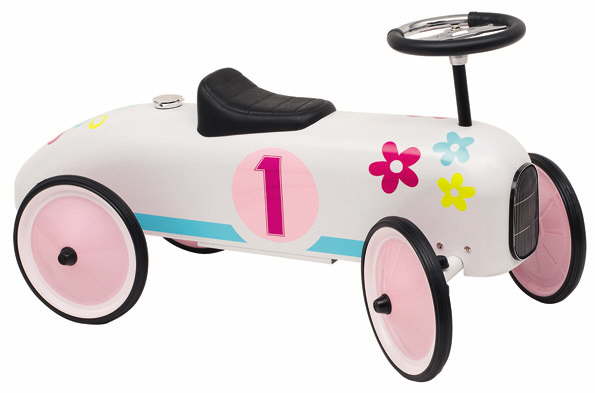 This great new design floral retro speedster ride on kids toy is pure energy! Vibrant white coloured steel body with detailed pink makes this ride-on toy blow away its plastic counterparts. Also features a working steering column and rubber tyres for extra grip.