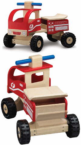 This is a strong, durable wooden stained ride-on fire engine for imaginative play. Recommended for 18 months to around 4 years.