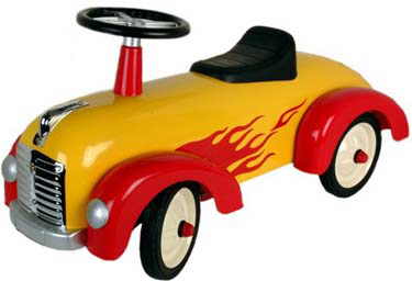 This great new retro speedster is pure energy! Vibrant colored steel body with detailed chrome makes this ride-on toy blow away its plastic counterparts. Also features a working steering column, flared wheel arches, red flame graphics and rubber tyres.