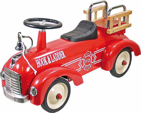 This great new retro speedster Fire engine is pure energy! Vibrant colored steel body with detailed chrome makes this ride-on toy blow away its plastic counterparts. Also features a working steering column, flared wheel arches and rubber tyres.