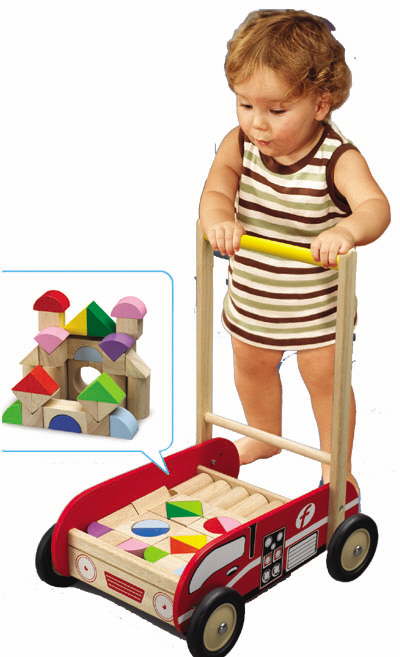 A truly wonderful traditional blocks walker in a fire engine design. The baby walker comes with various shapes ideal for learning and building towers, encouraging counting skills, colour and pattern skills, whilst also encouraging your little ones tender steps!
