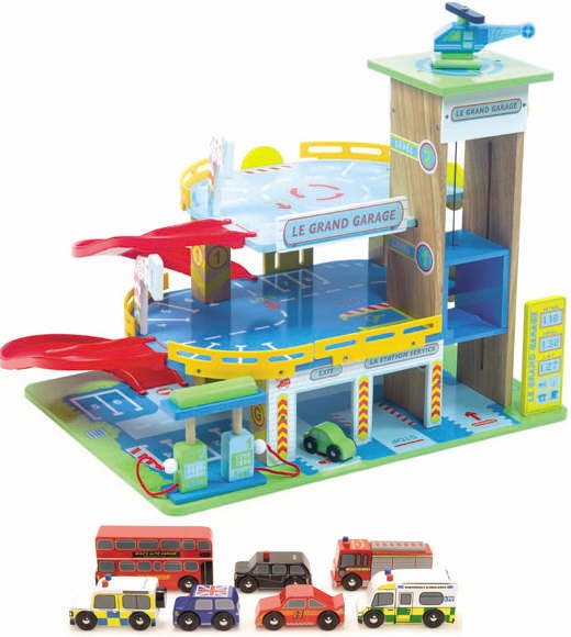 This wooden car park garage is a fine three storey building with ramps and working elevator. The play set includes a helicopter, car and a petrol pump. In addition to this we have included a 7 piece London vehicle set as shown in above picture comprising of: