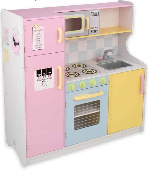 This exceptionally high quality wooden kitchen play set is the ideal kids nursery toy, great for role play. Made from high quality wood, fantastic pastel coloured kitchen with built in play fridge-freezer, microwave, oven, sink and hob. Plus taps and dials to turn. There is plenty of storage space for all your play kitchen kit.