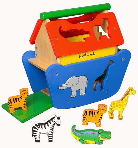 shape sorter in the style of Noah's Ark. Put the animals through the correctly shaped holes!