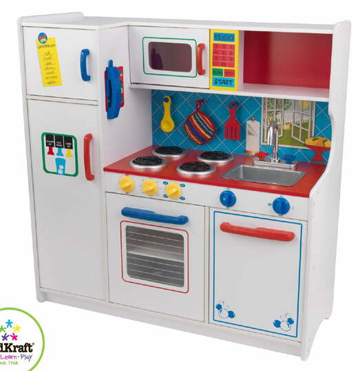 The Lets cook play kitchen is a great fun childrens pretend kitchen which is suitable for both boys and girls, it features raised burners, Refrigerator, freezer, oven and microwave and its large enough that multiple children can play at once.
