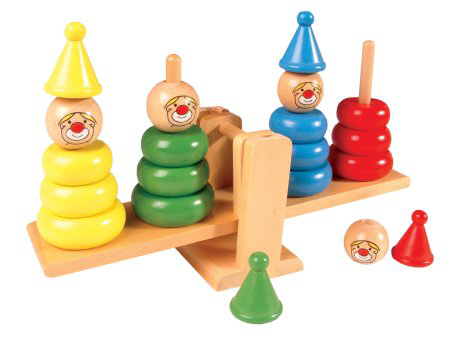 Learn how to balance different weights.Simple wooden see-saw and four pile up clowns are combined to form this great educational toy!Size: 29cm x 9cm x 17cm